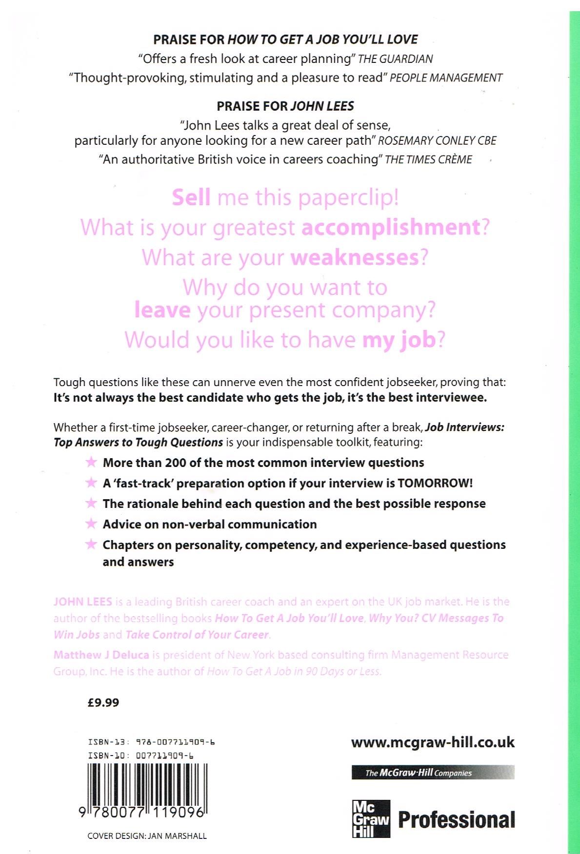 Job Interviews: top answers to tough questions is your indispensable guide to thriving in any interview situation. Top UK Careers Guide and bestselling author, John Lees', has joined forces with American careers expert, Matthew J Deluca, to take you through the whole interview process.